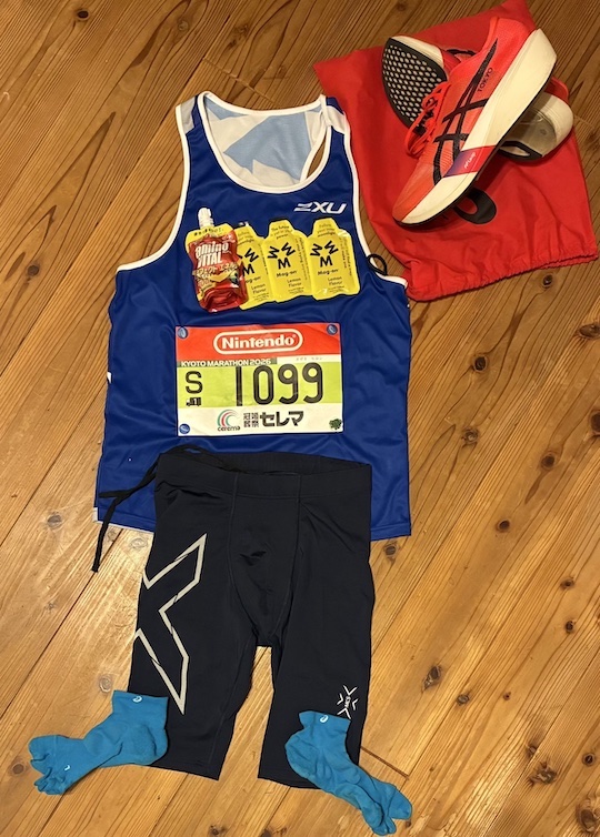 当日のウェアなどは下の画像の通り。シューズはもちろんアシックスのMETASPEED EDGE TOKYO。今まで一番相性のいいシューズで、自重の意識を忘れさえしなければ、このシューズが自分をゴールまで運んでくれる、自分にとってはそれくらい優れたシューズです。
